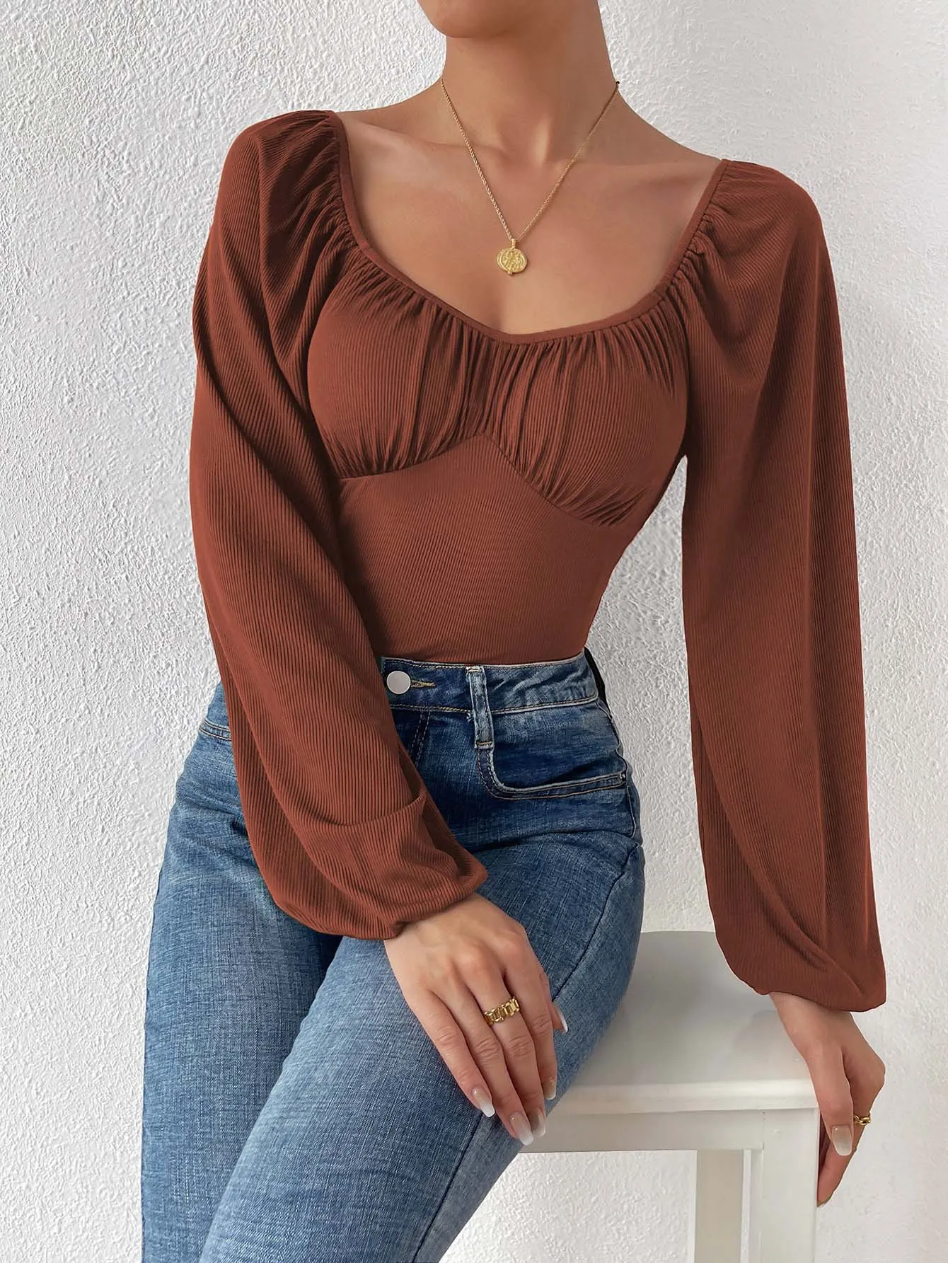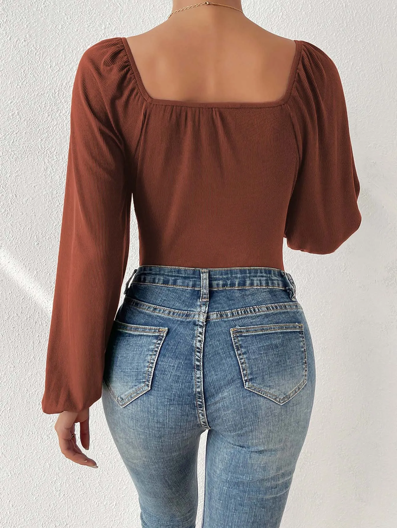 Body femme manche longue col carré élégant marron l’allure chic qui structure votre silhouette