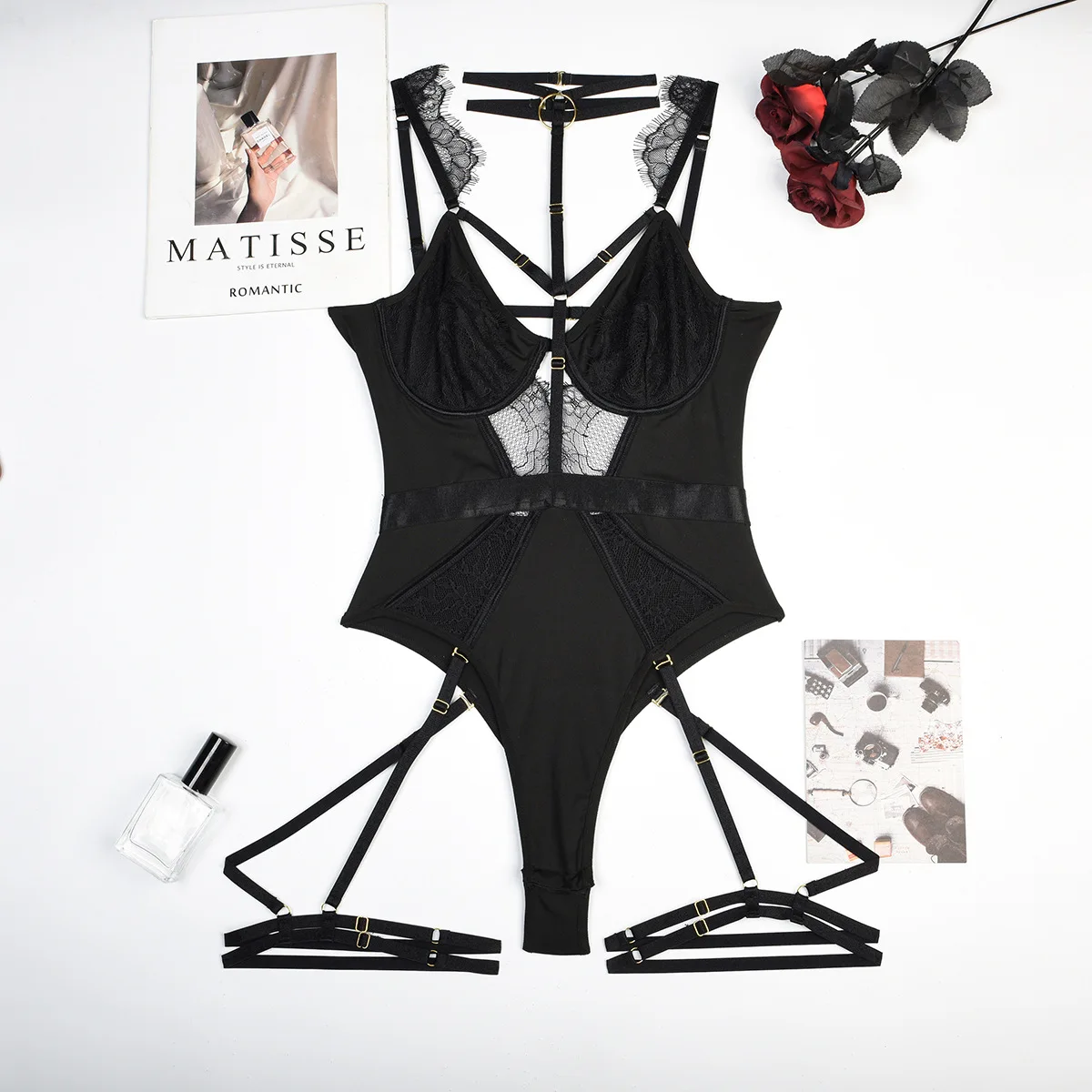 Éveillez vos sens avec la délicate dentelle au toucher, les sangles qui dessinent votre silhouette, et les jarretelles qui apportent un mouvement subtil. Visualisez-vous dans ce body, admirant les lignes harmonieuses qui attirent le regard et approfondissent votre confiance. Vous serez mise en valeur par des détails raffinés, tels que le harnais et les découpes, qui soulignent vos atouts. Immergez-vous dans une expérience sensorielle unique qui stimule votre charme naturel.
