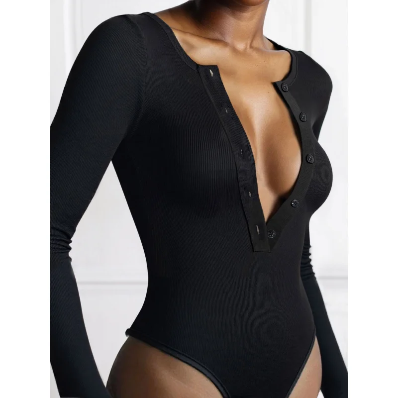 Body Noir Côtelé Femme À Bouton Confortable Manche Longue